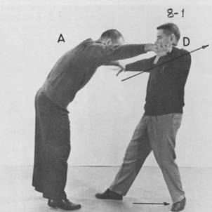 #7. Two Hands Against Two Wrists Before Normal Grip is Secured. (Fig 7-1,2) A attempts to grab D's wrists. D slides one foot back and bends the knees. In doing so he lifts A's arms by bending upwards his wrists to cradle A's wrists in the crescents formed by his thumbs and index fingers. Bending the knees is very important, otherwise, D may not be able to avoid A's attack. Then D pushes A's arms up, while keeping his own extended, and kicks A's closest shinbone with his rear (left) foot. D sets this foot under A's corresponding wrist, pivots rightwards on the ball of the left foot and at the same time, throws A's arms in the opposite direction, to the left. A's right side is now wide open for retaliation and D may for instance, strike it with a left elbow jab. This is the only preventive, "before", technique in basic ASP which is classified separately from the "secured" one. Here D learns to move his body in unison with A. As A moves toward D, the latter must move away from A at the same speed so as to keep their mutual distance almost unchanged. ![]() ![]() #8. Two Hands Against Two Wrists - Normal Grip is Secured. (Fig. 8-1,2,3) Same attack as previously, but D was not able to prevent the grip. D opens his hands, kicks A on the shinbone sets the kicking foot under A's grip, and slides the other foot back, far enough to swing his arms open and pull A forward. D's extended arms serve only as connecting rods: he should not attempt to use them otherwise, because against a stronger and heavier opponent, he will undoubtedly fail. D must relax the shoulders and pull with the body; all he wants is to make A react so as to grab his wrist. A's reaction is to bring his hands close together. Since D is expecting just that, he helps A to achieve his purpose, then, with his left hand, D grasps A's left wrist. Now, D pointing the fingers of his right hand toward his own body, thrusts his right wrist in that direction, bringing his right forearm close to A's left forearm. The thinner upper part of D's wrist applies pressure against A's thumb and forefinger. By dropping the hips and extending the right forearm and fingers toward the direction of his own left knee, D breaks the hold. He then bends the knees and pivots leftward lifting at the same time A's left arm to expose A's side, against which he retaliates at will with a punch or an elbow jab. ![]()